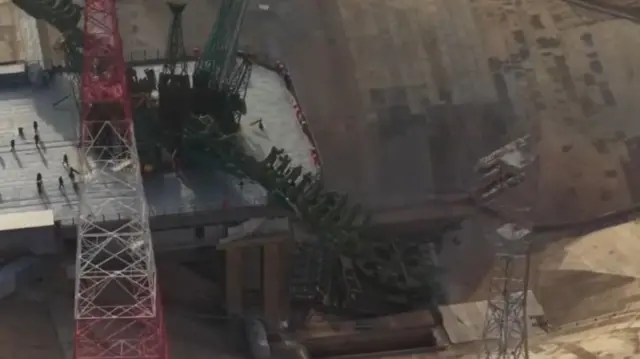 Але щойно ракета зникла в небі, на майданчику № 31 стався обвал. Гігантський «сервісний балкон» — конструкція вагою сотні тонн — не встиг відійти за броньовану стіну і впав прямо в зону стартового столу. Відео з місця події облетіло світ: бетон, арматура, дим.