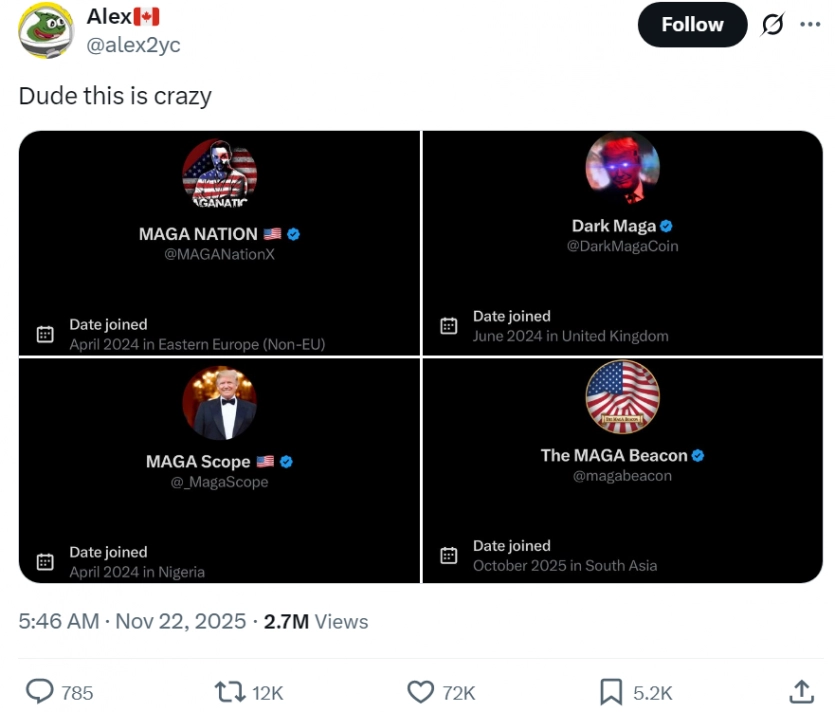 У профілях, де роками писали про “порятунок Америки”, “загрозу демократії”, “MAGA forever” або “боротьбу з Трампом”, раптом з’явилися геомітки… з Нігерії, Індії, Таїланду, Бангладеш, Австрії та Східної Європи.